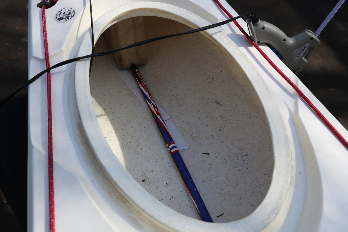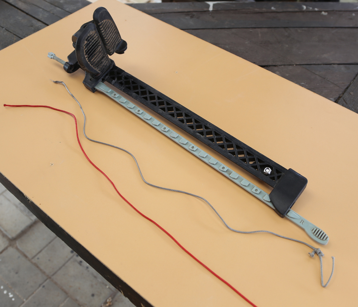 Непосредственно в начале гребного сезона я получил обрыв тросика для управления рулем каяка. Надо признать, что такой обрыв очень неприятен на дистанции марафона, потому что каяком очень сложно управлять, даже полностью ослабив симметричный оборванному тросик. Каяк стремится плавать по кругу, и мало что из активного руления кренами и веслом помогает.