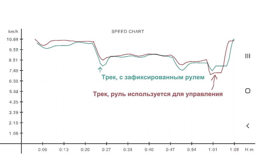 Я сделал два замера трека длиной чуть больше 10 км. Один трек с рулем, второй — без. На фото — совмещенные диаграммы скорости. Вывод: без руля плавать можно только без ветра, течения и поворотов. Средняя скорость как минимум получается не выше, чем с полноценным управлением рулем.
