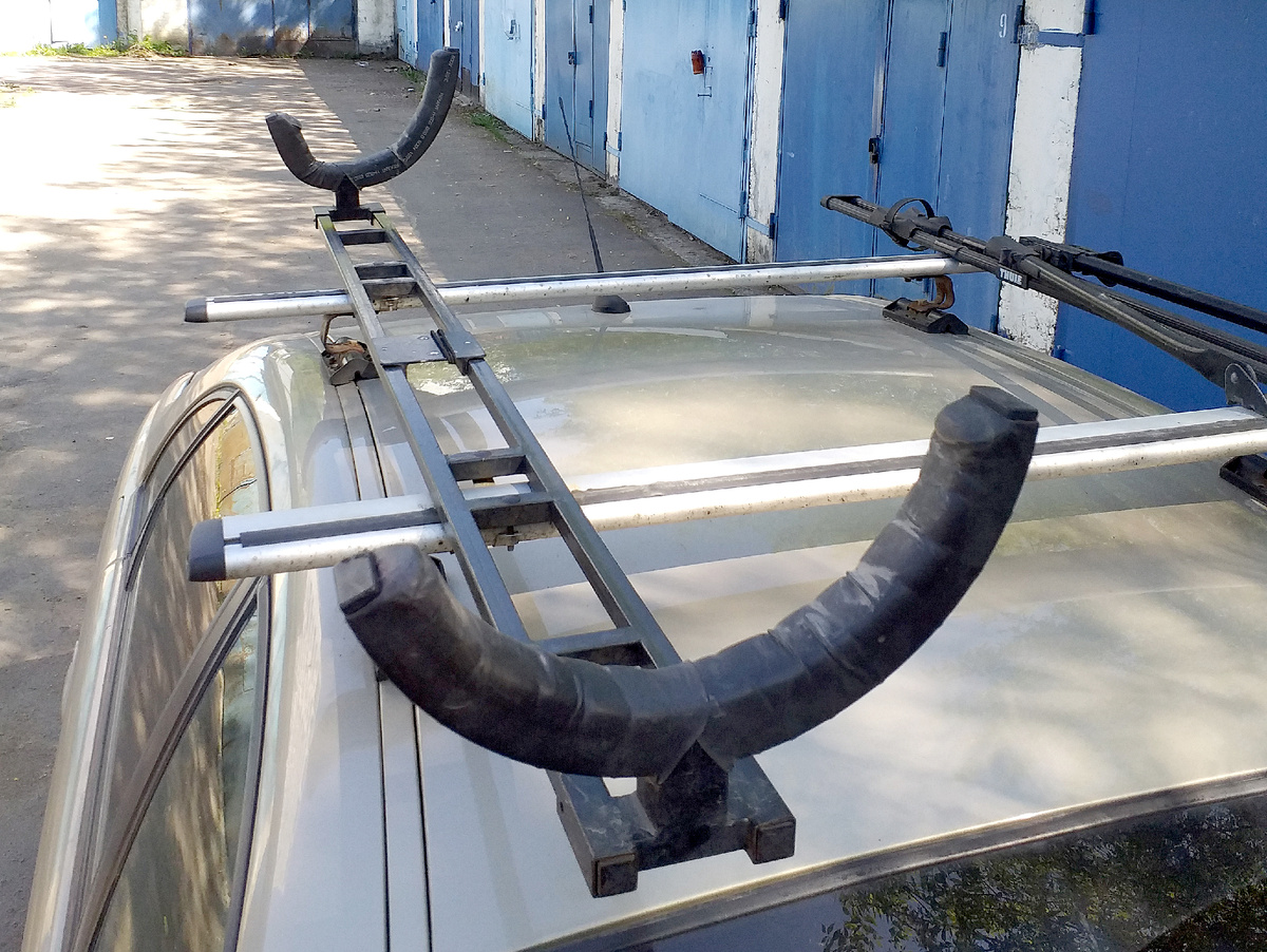 Имея в парке лодок самые разнообразные суда, я столкнулся с необходимостью перевозки их на крыше авто. Некоторые каяки слишком длинные, чтобы их привязывать сразу на дуги багажника. Сплавные лодки — слишком пухлые. Слаломные, спортивные — слишком хрупкие. Серф сильно парусит при горизонтальном расположении. В результате я разработал и доработал универсальный держатель из направляющей рельсы, которую не снимаю с багажника, и навесных скоб под разные формы лодок.