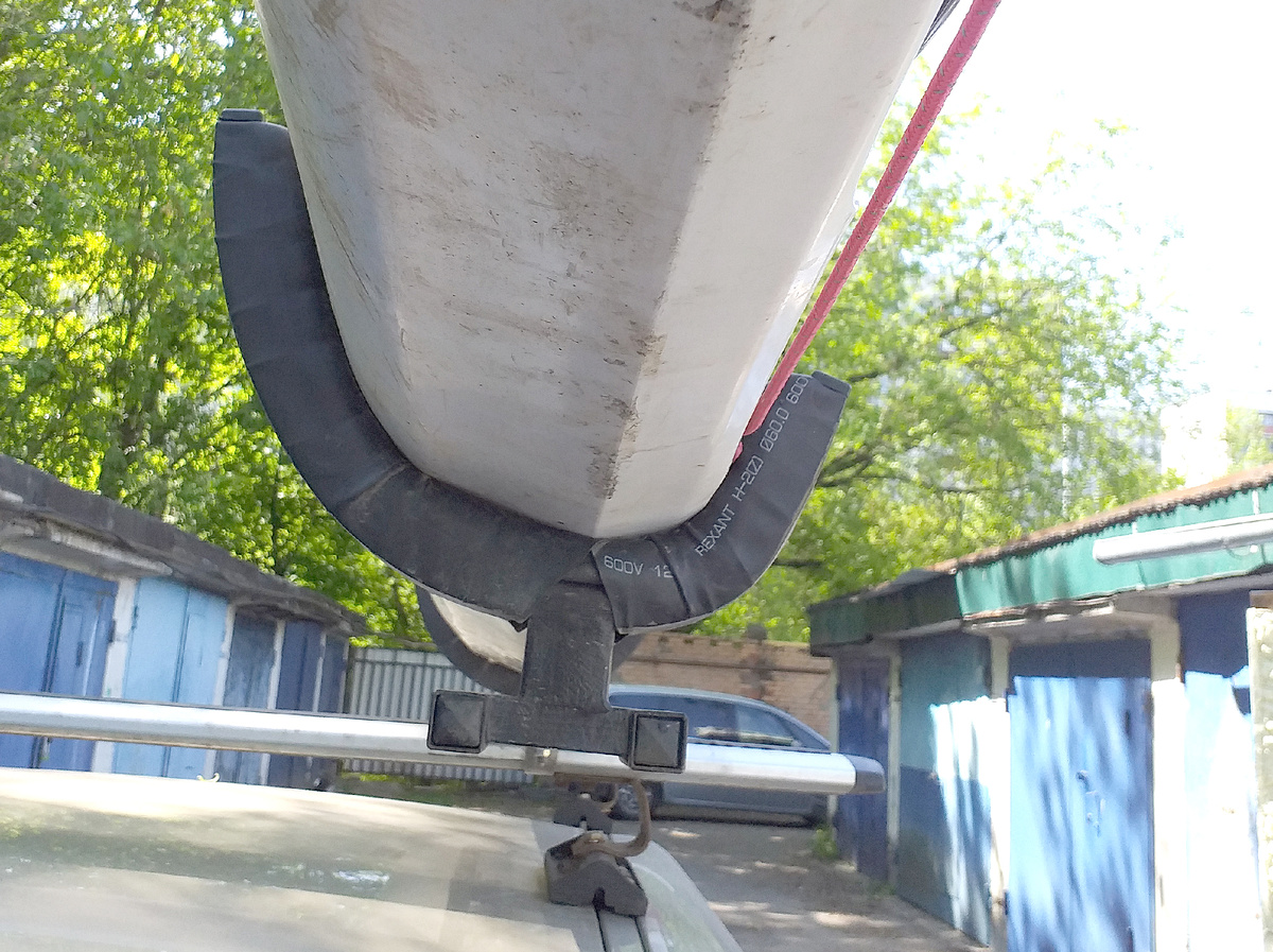 Держатель представляет собой рельсу из профиля 20 х 20 мм, закрепленную Т-образными винтами к дугам машины или скобами вокруг дуг (на выбор, но можно сделать оба варианта для удобства). На рельсу можно быстро установить и снять держатели любой формы и назначения. Некоторые лодки приходится возить боком, чтобы не промять, держатели могут быть специально разработаны для этих лодок.