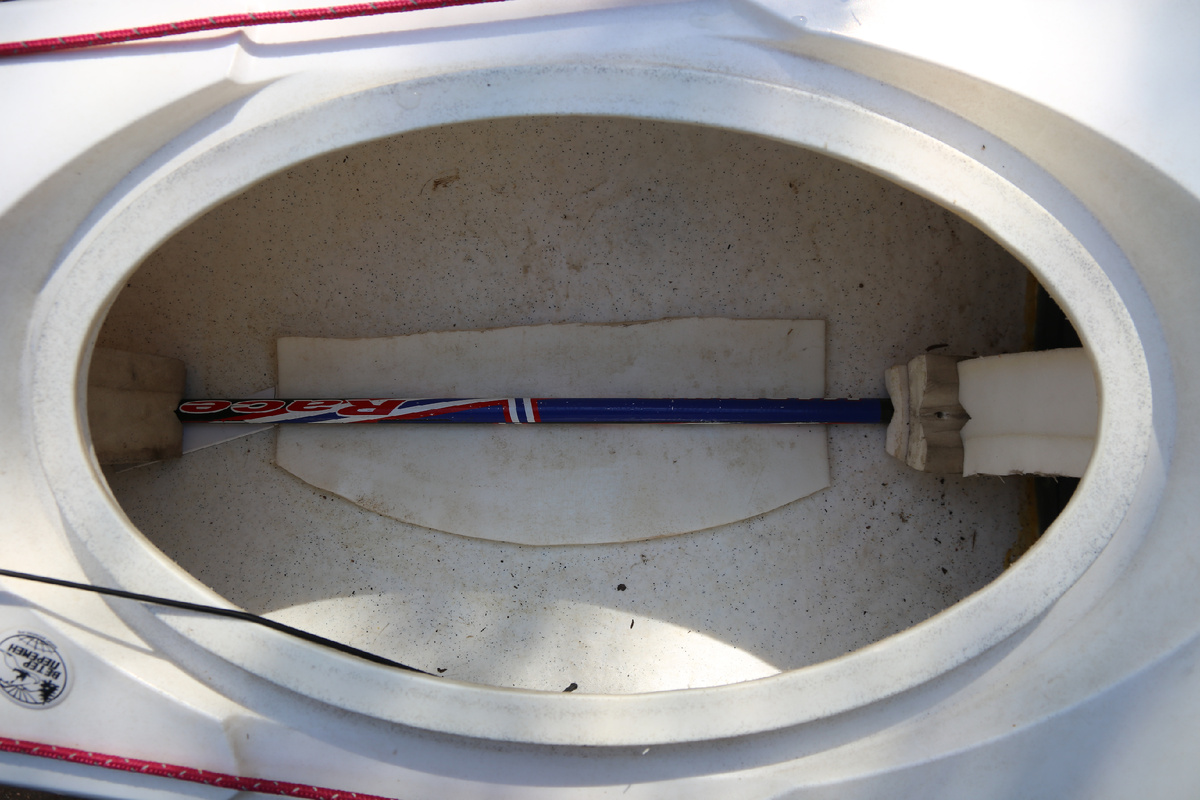 Для участка Б я делаю пиллерс в корму и нижнюю вставку вдоль дна из карбоновой лыжной палки. Пиллерс представляет собой подушку из твердой пены, которая ставится в корму в распор между верхней декой и дном, вдоль которого укладывается лыжная палка. Таким образом, вес распределяется по всему дну каяка, а не давит в какую-то конкретную точку.