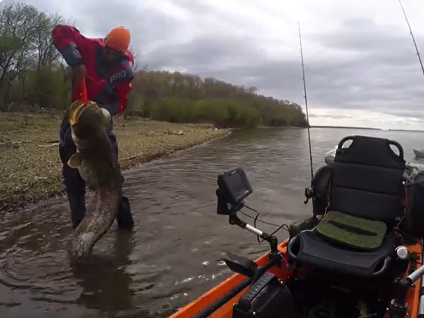 Управиться с тяжелой и сильной рыбой на течении большой реки оказалось несложно. Нужно было контролировать свое положение в каяке и положение каяка относительно течения. В этом помогает педальный привод ImpulseDrive — им легко подержать или развернуть лодку, не выпуская удилище из рук.